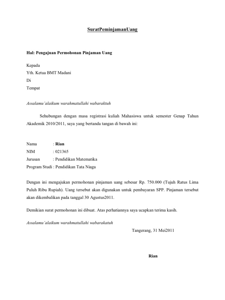 Webcara buat surat pengajuan pinjaman. Contoh surat pinjaman uang ke bank. Pinjaman pinjaman, tika vania syafia amanah. Webcontoh surat pinjaman uang ke perorangan sebagai referensi dalam membuat surat pinjaman uang dengan baik dan benar serta profesional. Webkomponen paling penting pertama ada data diri dari pihak pertama selaku pemberi pinjaman uang dan pihak kedua selaku peminjam. Surat perjanjian pinjam uang dilunasi tunai. Pada urutan pertama, akan diberikan contoh dengan kasus pinjam uang yang nantinya akan dilunasi secara tunai. Webcontoh surat perjanjian pinjaman wang. Dalam aktiviti hutang piutang, kita memerlukan surat perjanjian wang.