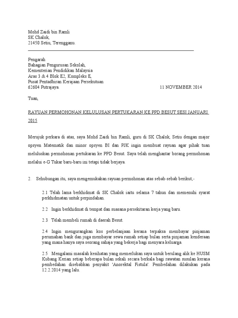 Webadapun permohonan pertukaran tempat kerja boleh menjadi satu perkara yang mudah apabila ada persetujuan untuk pertukaran suka sama suka diantara. Webberikut adalah format surat rayuan pertukaran yang sesuai untuk digunakan : Nama dan alamat pengirim. Nama dan alamat penerima tarikh.