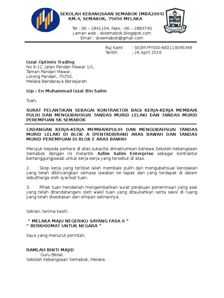 Contoh surat perjanjian perlantikan kontraktor. Sekiranya anda menyebut lebih daripada satu kejadian, bahagikannya kepada 2 perenggan berbeza dan akhiri perenggan dengan kualiti. Contoh surat rasmi lantikan jawatan kuvelu tetseo. 36758716 surat persetujuan pengubahsuaian rumah.