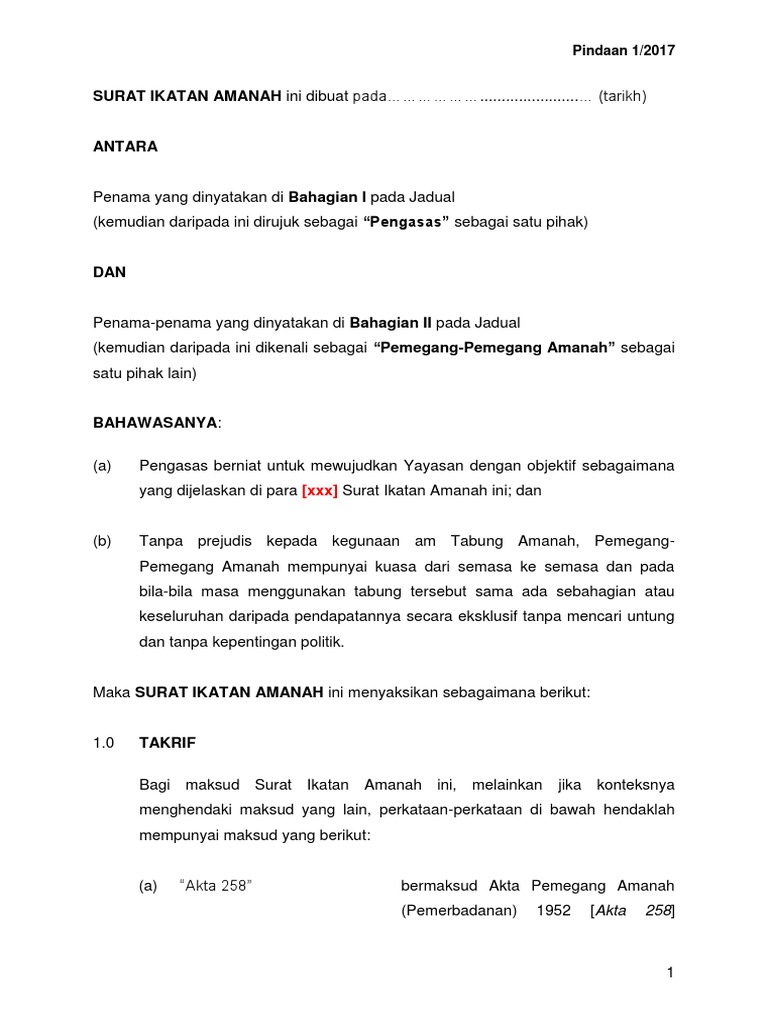 Surat ikatan amanah tersebut akan didaftarkan di pejabat tanah. 533 format arahan amanah surat ikatan amanah adalah seperti di lampiran d1 dan d2. Untuk mewujudkan ikatan pemegang amanah yang sah, satu surat cara ikatan amanah akan ditandatangani oleh pemberi amanah dan pemegang amanah. Contoh surat perjanjian sewa. Beli tanah lot geran kongsi guna surat ikatan amanah. Surat ikatan amanah (sia) kini menjadi instrument. Pindaan surat ikatan amanah pemerbadanan pemegang amanah. Senarai semak pindaan surat ikatan amanah; Perlantikan semula atau perlantikan pemegang amanah.